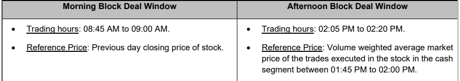 In India, a ‘block deal’ is a large trade executed in a single transaction with a minimum value of INR 25,00,00,000, during separate trading windows as provided by the stock exchange.